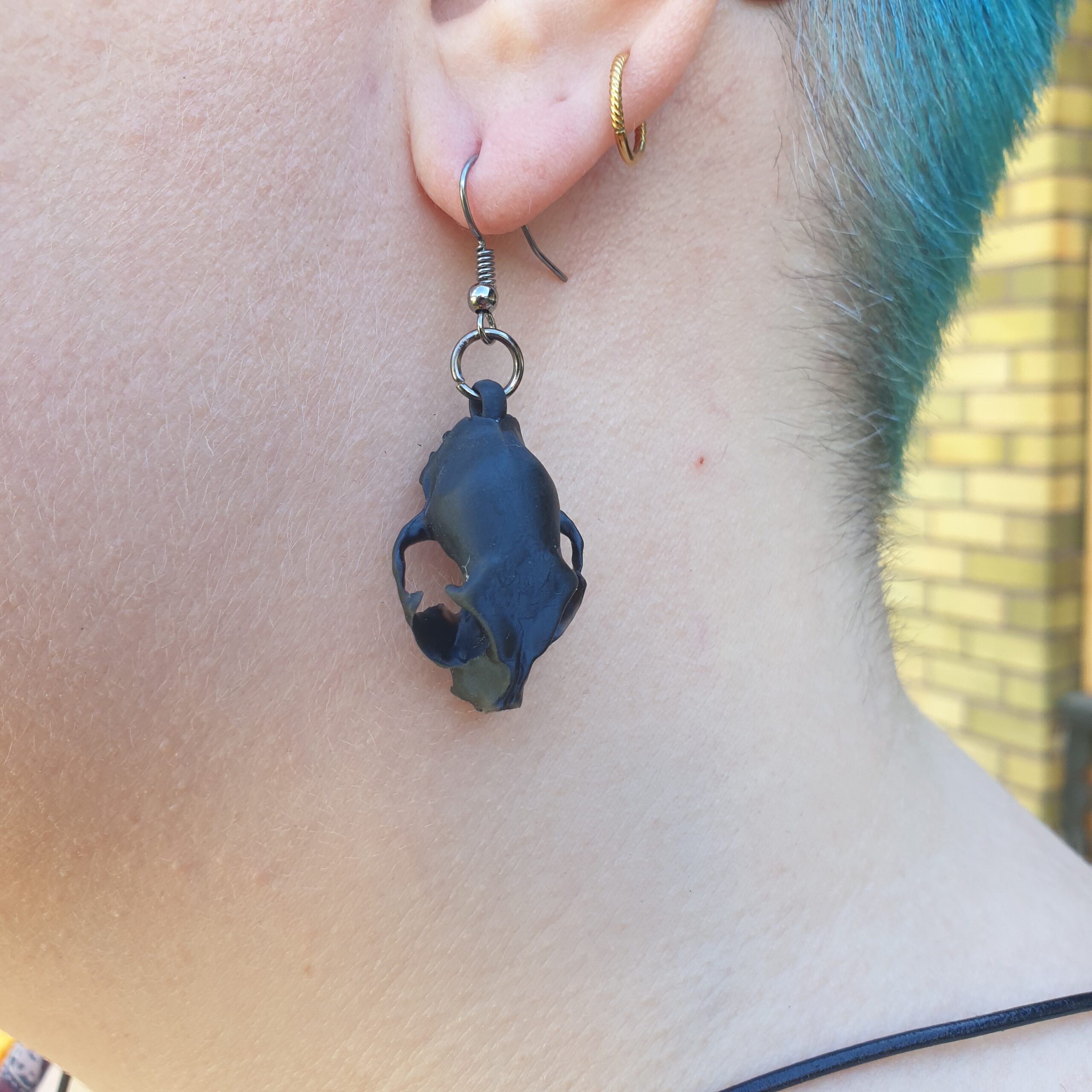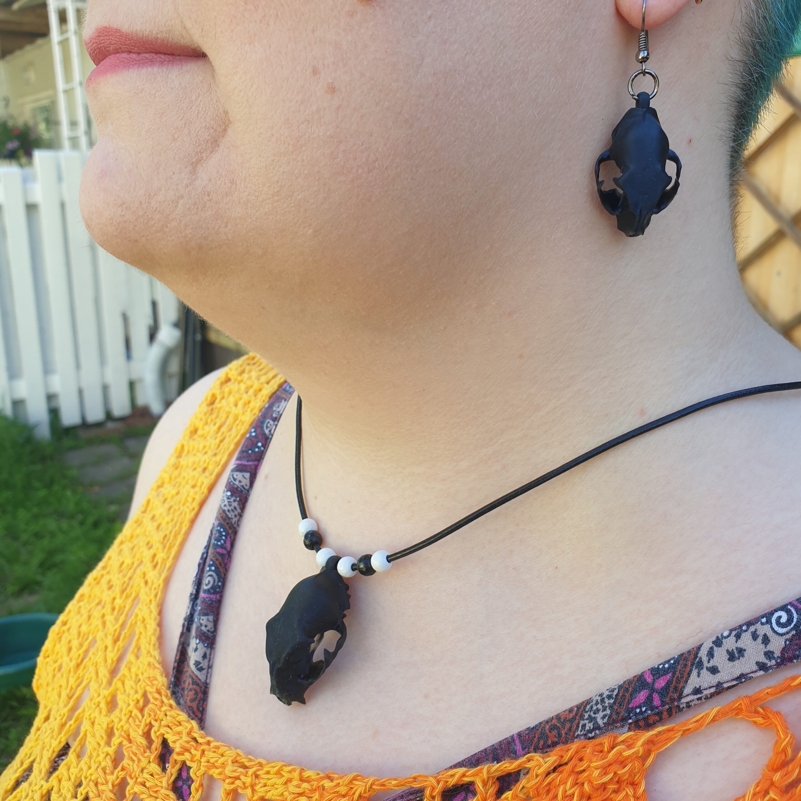Cat Skull Necklace and Earring- Set comes with simple leather string with black and white beads. Cat is anatomically accurate 3D-scan of a real skull and printed with quality black resin. String is easy to replace with your own chain or other material. Earrings are nickel and copper free.