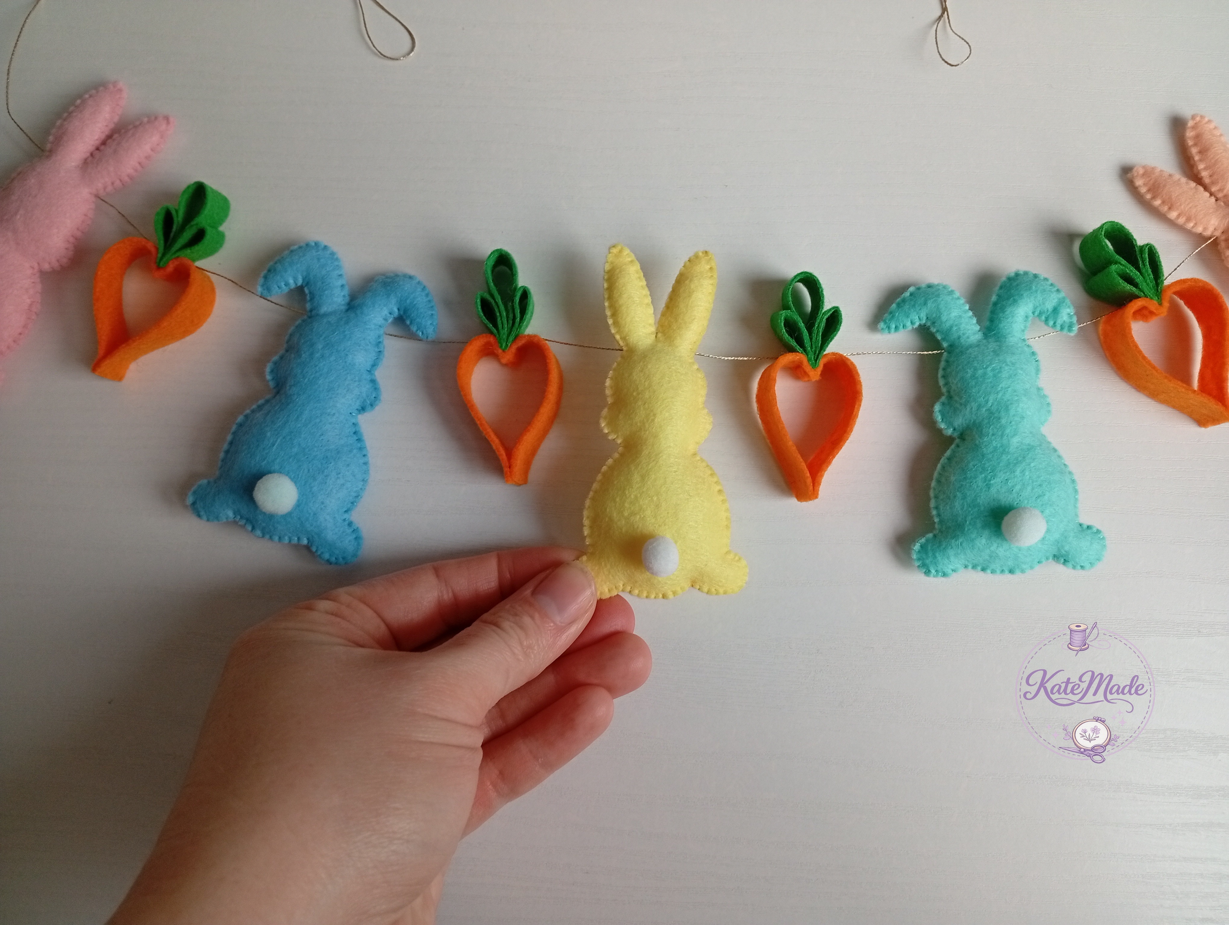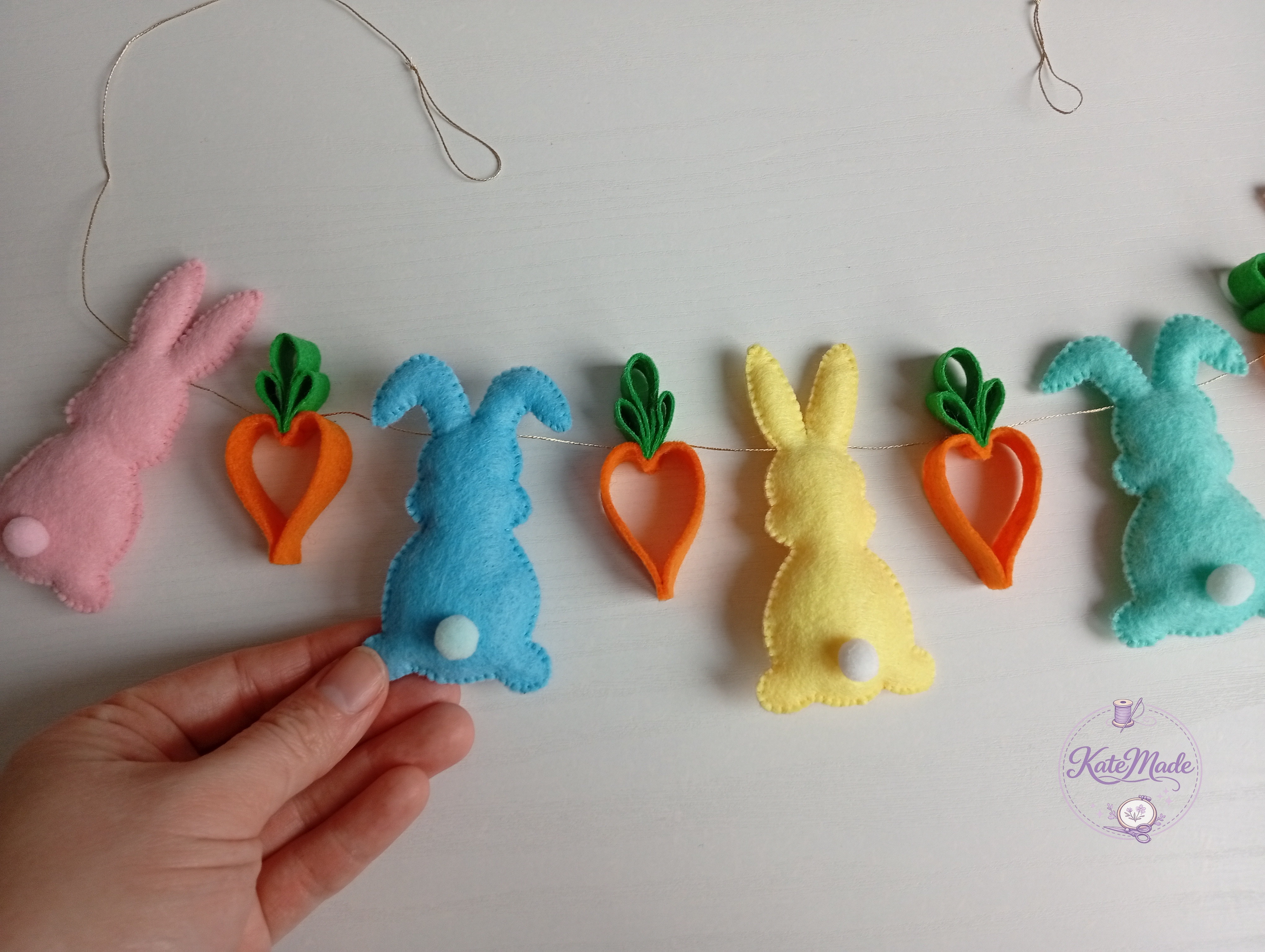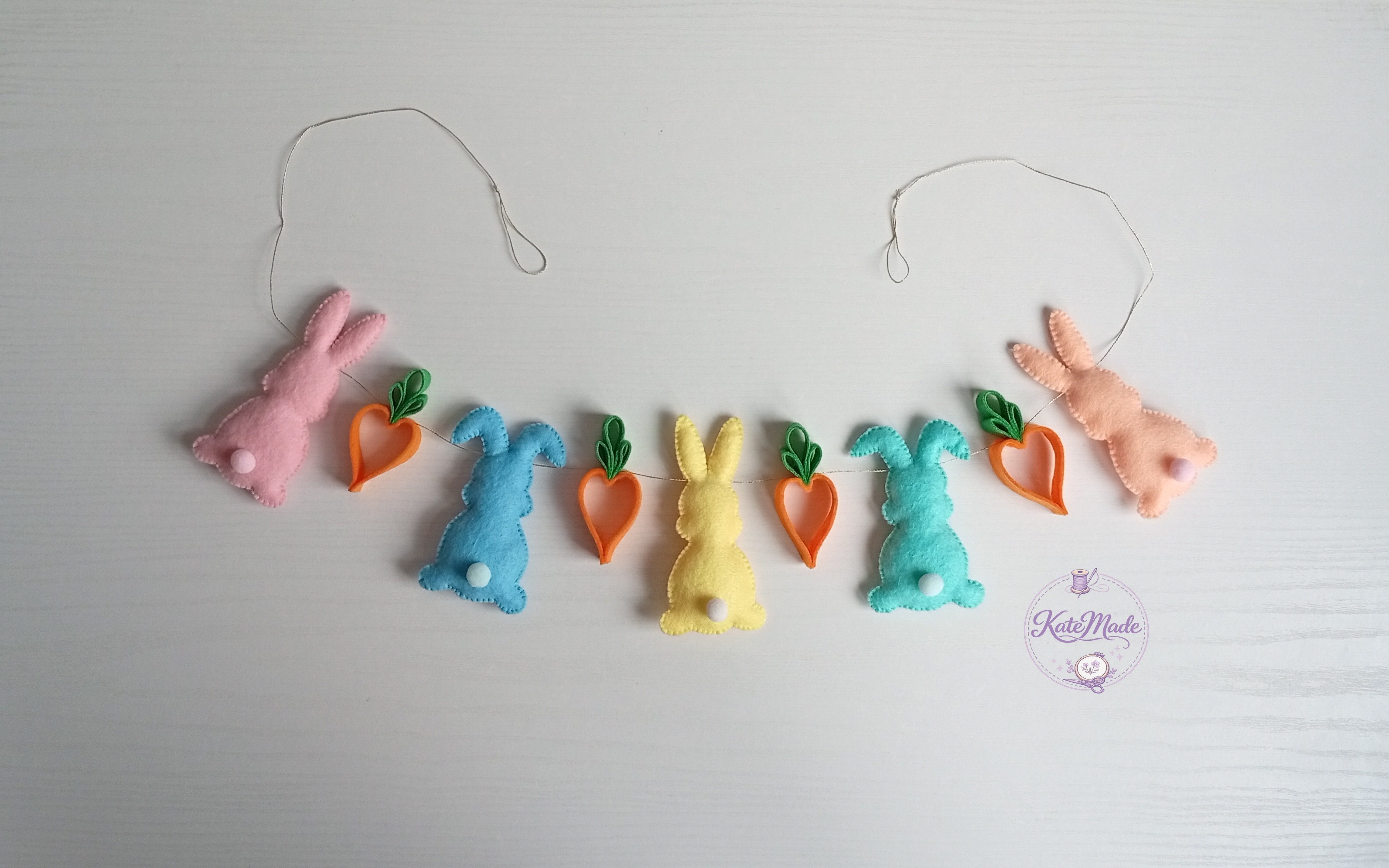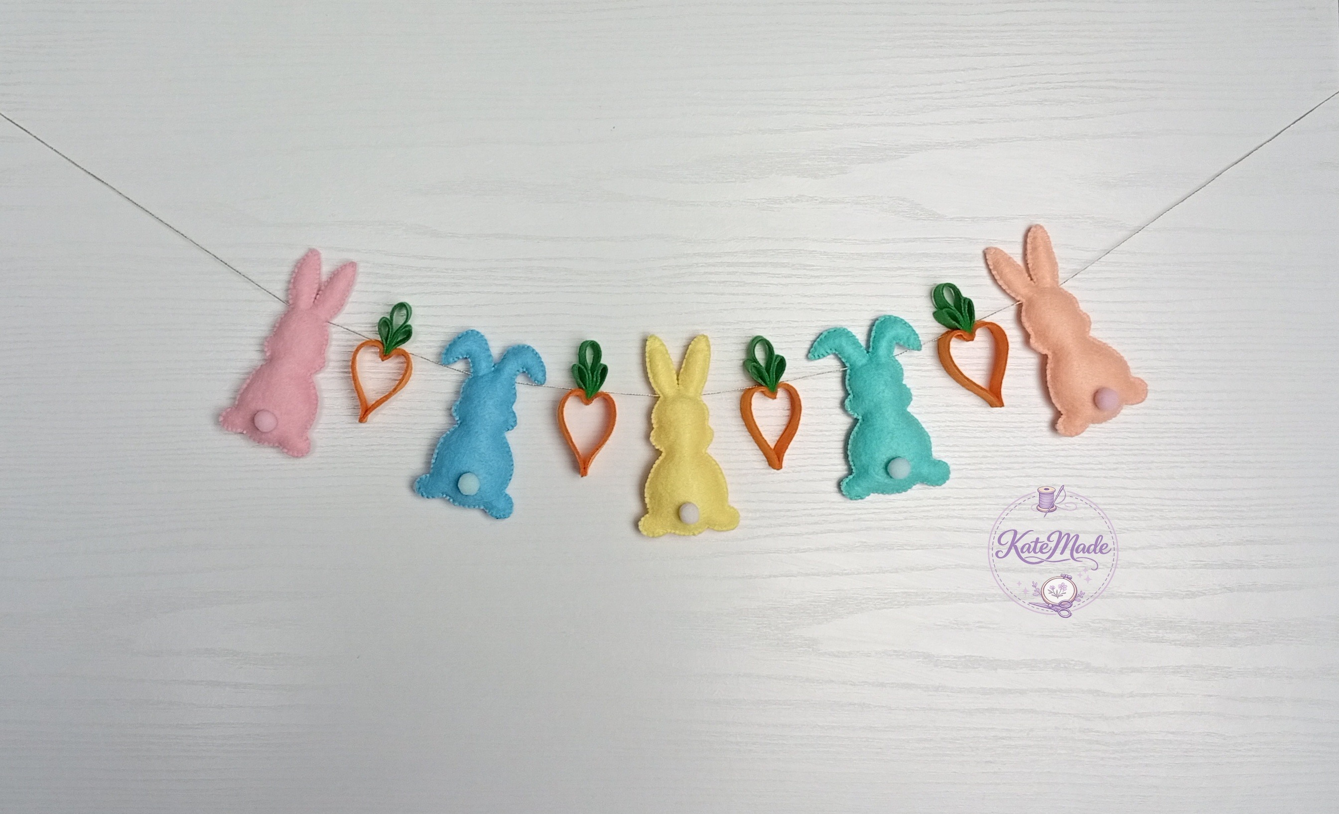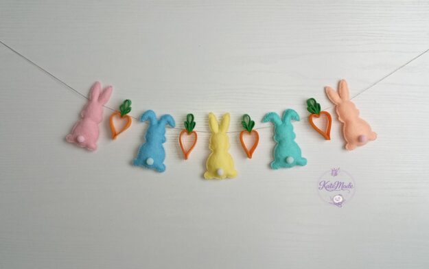 This bunting features 5 colorful felt bunnies with fluffy pom-pom tails and 4 cute stylized carrots. It’s perfect for decorating your fireplace mantel, nursery wall, or as a festive backdrop for your Easter brunch.