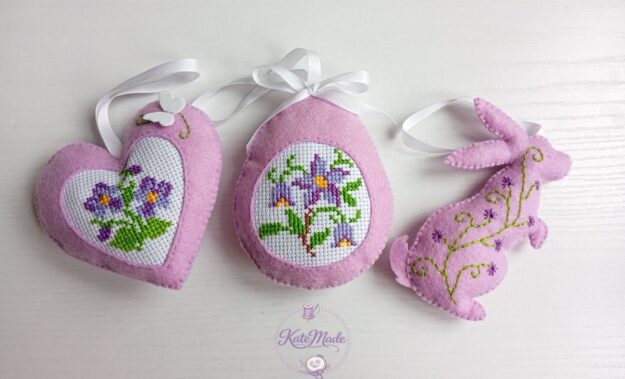 Bring a touch of cozy, hand-stitched charm to your home this spring. This delicate set of three Easter ornaments — a bunny, an egg, and a heart — is meticulously crafted from soft felt and decorated with detailed cross-stitch embroidery in a calming lavender and white palette.