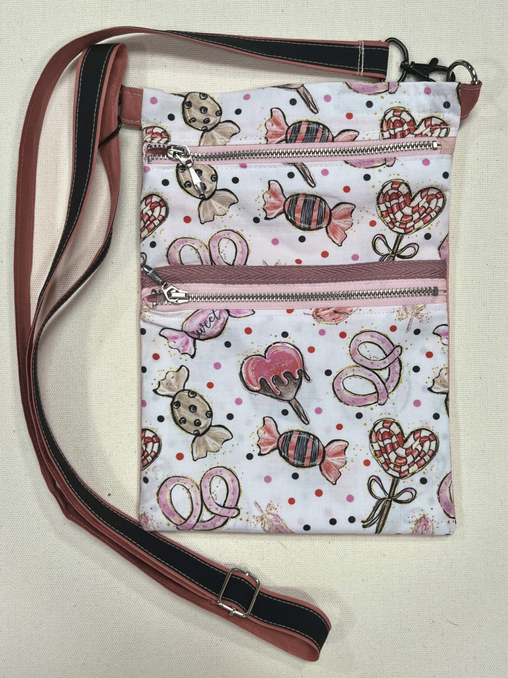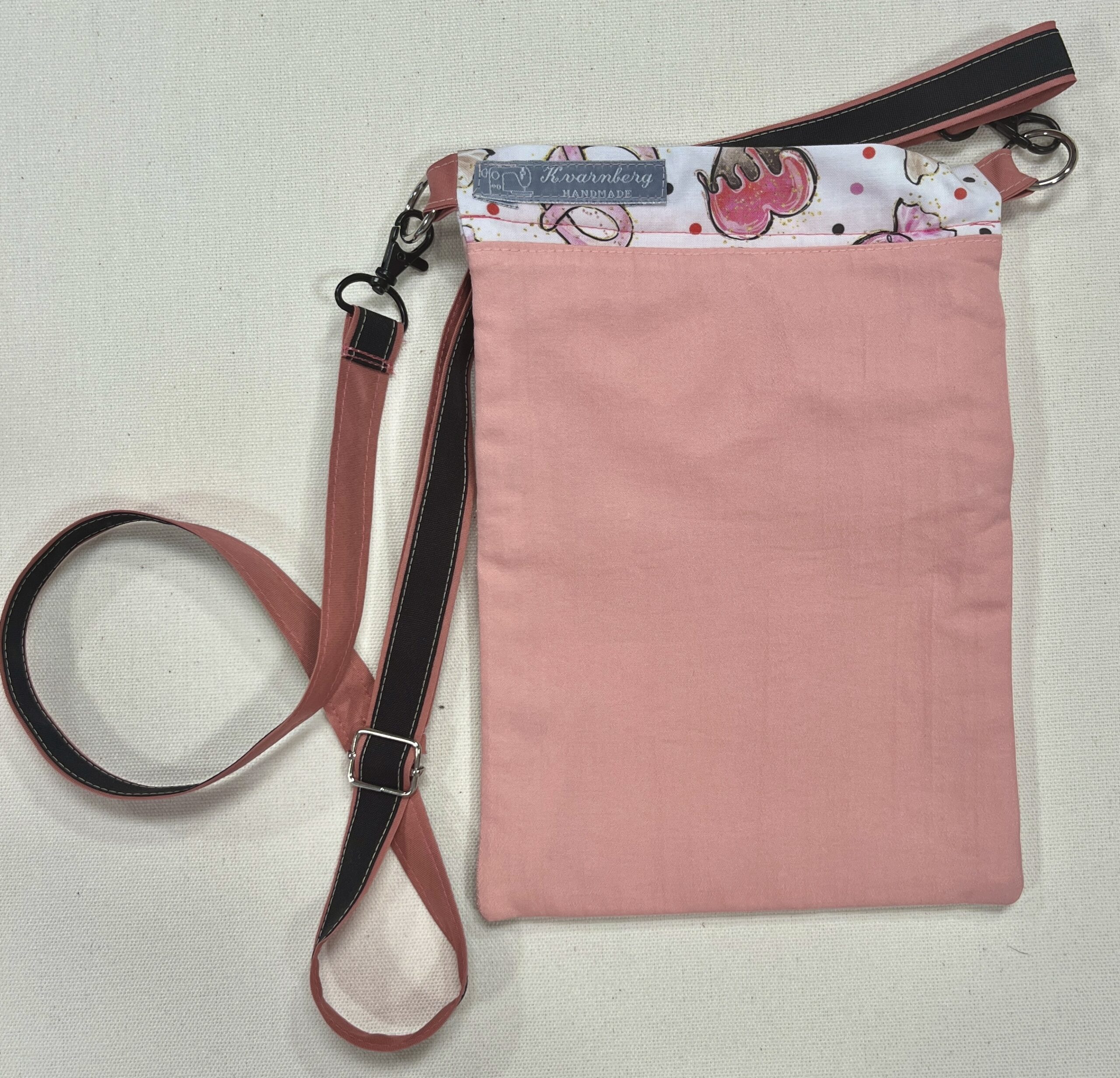Pieni olkalaukku joss säädettävä hihna ja kaksi vetoketjullista taskua. Materiaali puuvillaa, laukku on vuoritettu. Kankaat ovat ompelimon ylijäämä paloja ja muut tarvikkeet kierrätettyjä.