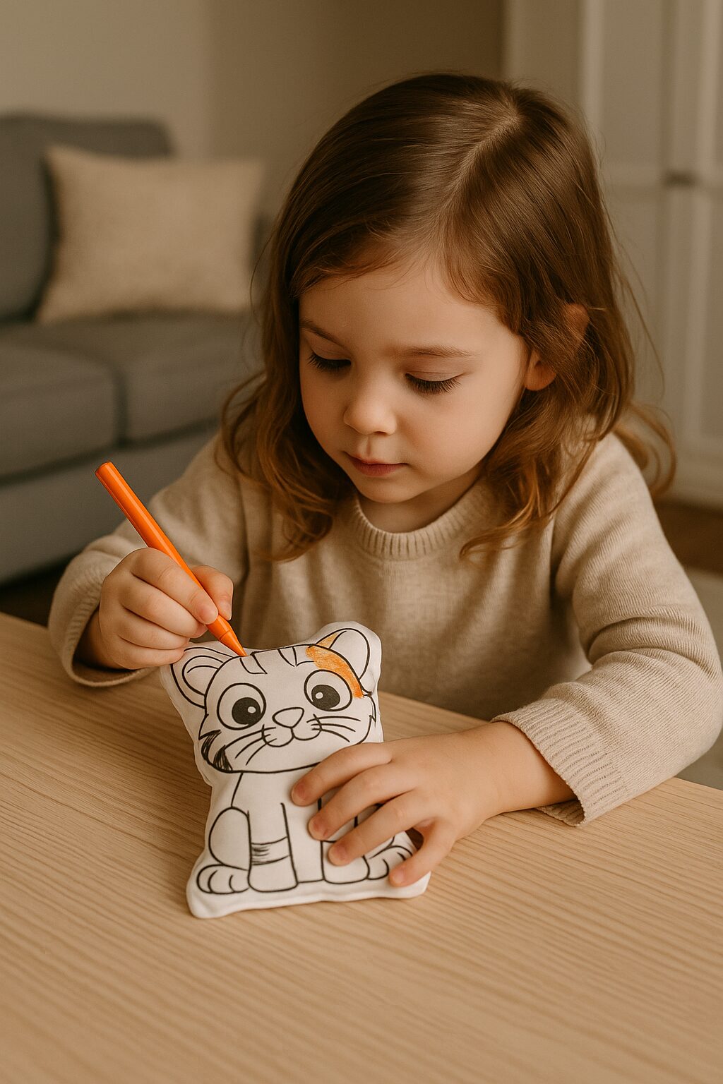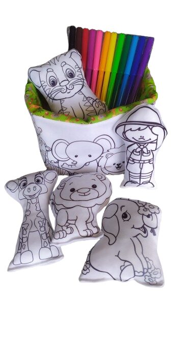 Este conjunto inclui 5 bonecos em tecido com desenhos de animais da floresta, ideais para colorir com as 12 canetinhas laváveis que acompanham o kit.
