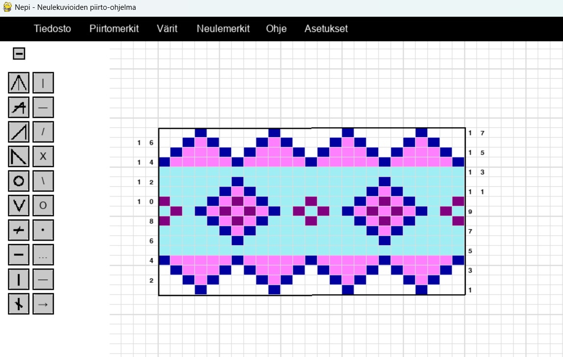 Nepissä on laaja valikoima valmiita neulemerkkejä sekä piirtomerkkejä, joiden avulla voit luoda haluamiasi merkkejä ja kuvioita. Työkalut on suunniteltu selkeiksi ja helppokäyttöisiksi, jotta voit keskittyä vain luomiseen.