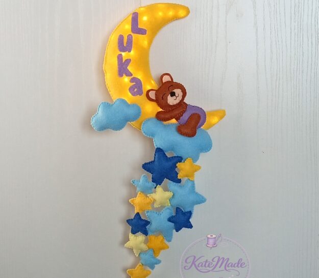 Create a serene and cozy atmosphere in your child’s room with this handmade personalized crescent moon night light. Whether it’s a bear on a cloud or a bunny, this custom felt ornament adds a gentle, warm glow perfect for bedtime stories and peaceful sleep.