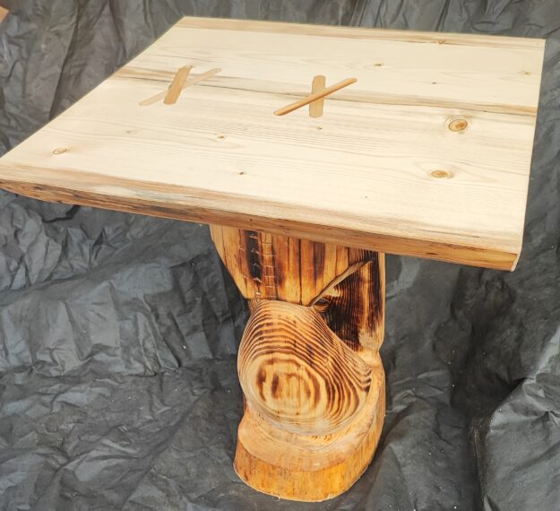 Jalan pintaa on kevyesti poltettu korostamaan puun syykuvioita. Koko pöytä on käsitelty vahaöljyllä, ja kansi on viimeistelty mehiläisvahalla, joka antaa kauniin luonnollisen pinnan sekä suojaa puuta.