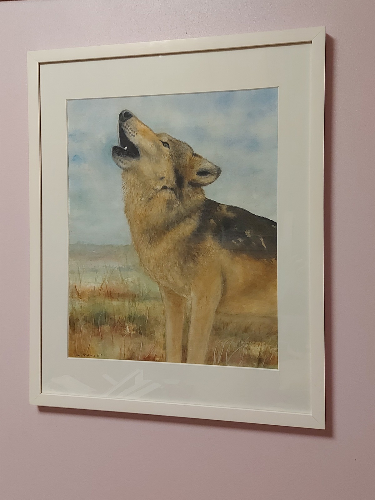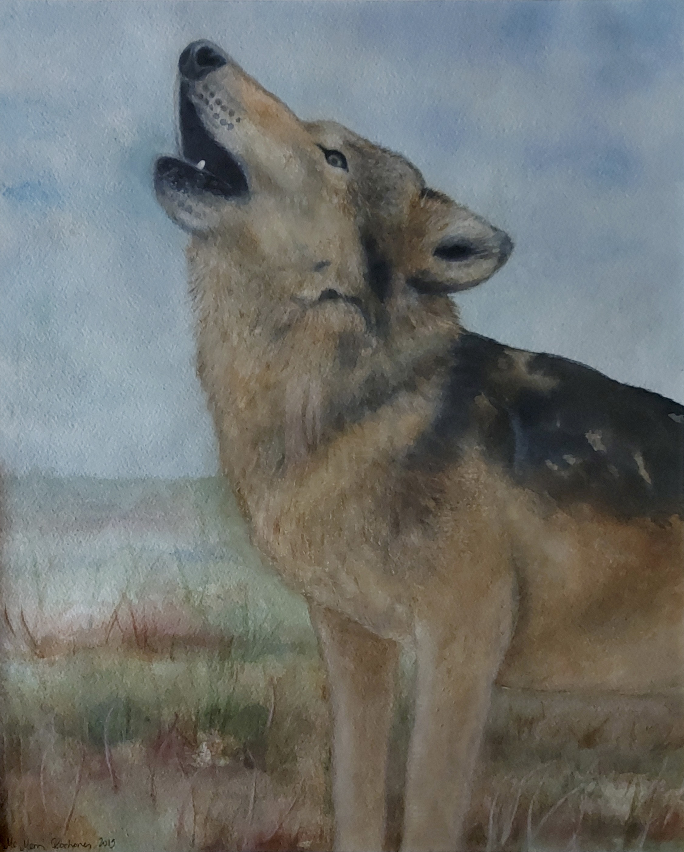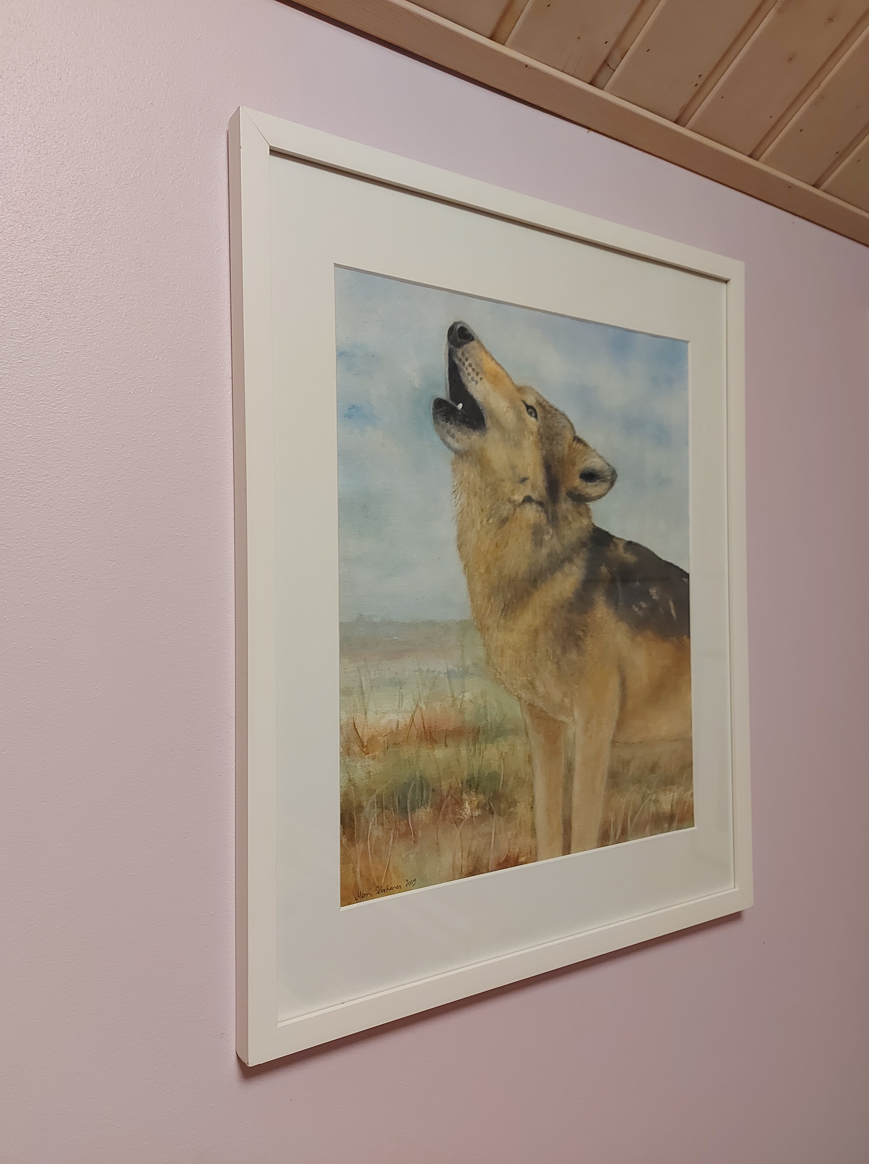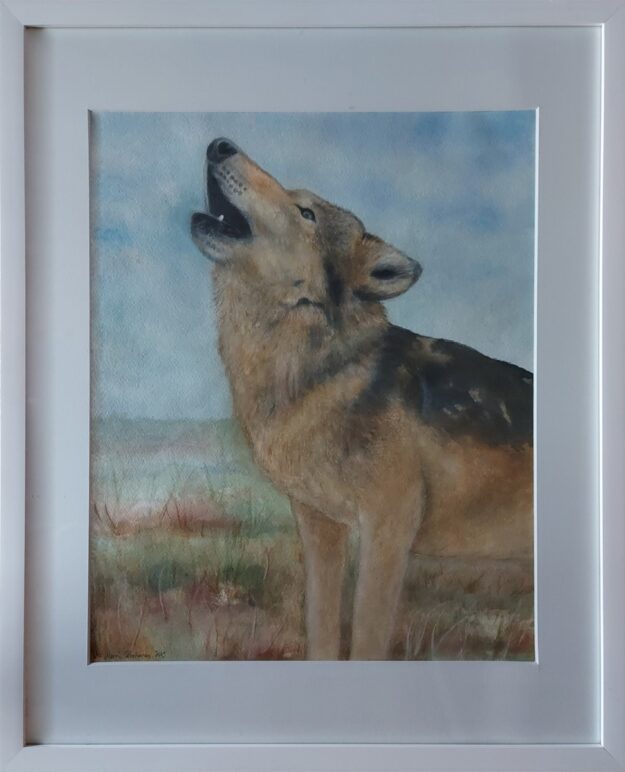 Luonto on ollut minulle aina tärkeä ja se näkyy vahvasti myös taiteessani. Tässä akvarellimaalauksessa susi ulvoo avoimessa maisemassa – hetkessä, jossa villi luonto, hiljaisuus ja voima kohtaavat. Sudessa on minulle jotain syvästi puhuttelevaa: itsenäisyyttä, herkkyyttä ja vahvaa yhteyttä ympäröivään maailmaan.