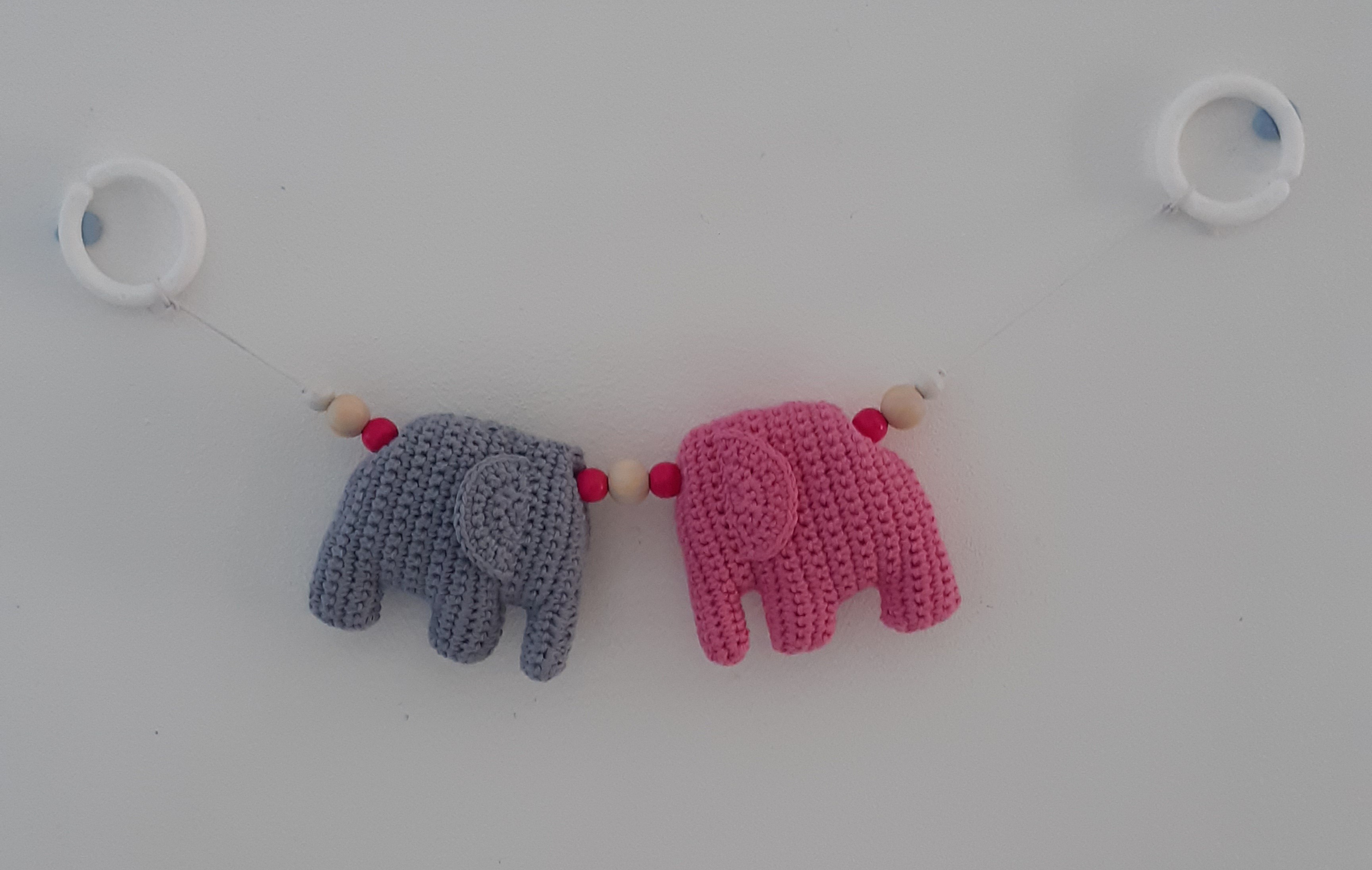 Yhden norsun koko n.9 cm x 8 cm. Virkattu puuvillalangasta, vanutäyte. Puuhelmet, pyöreä kuminauha ja kiinnitysrenkaat.