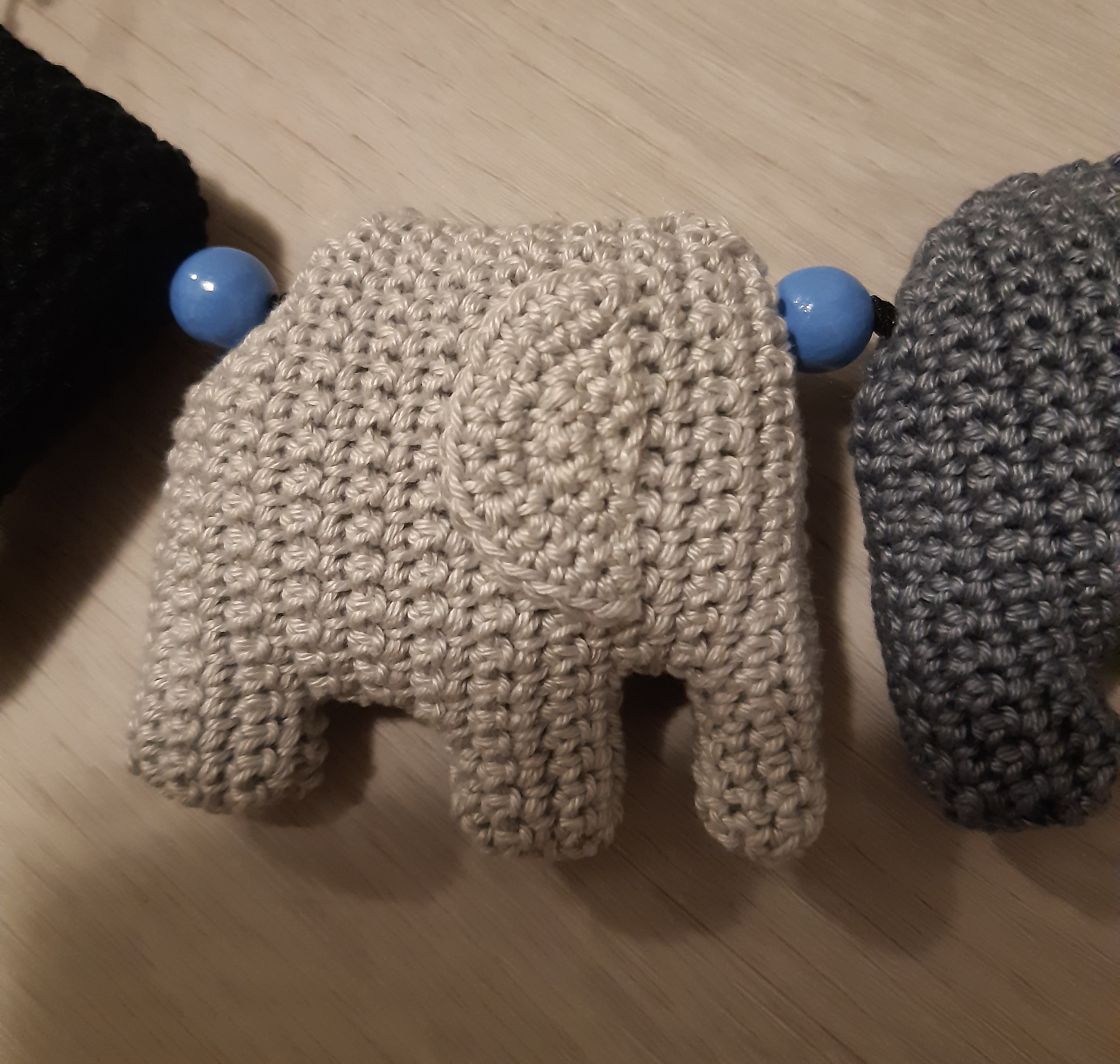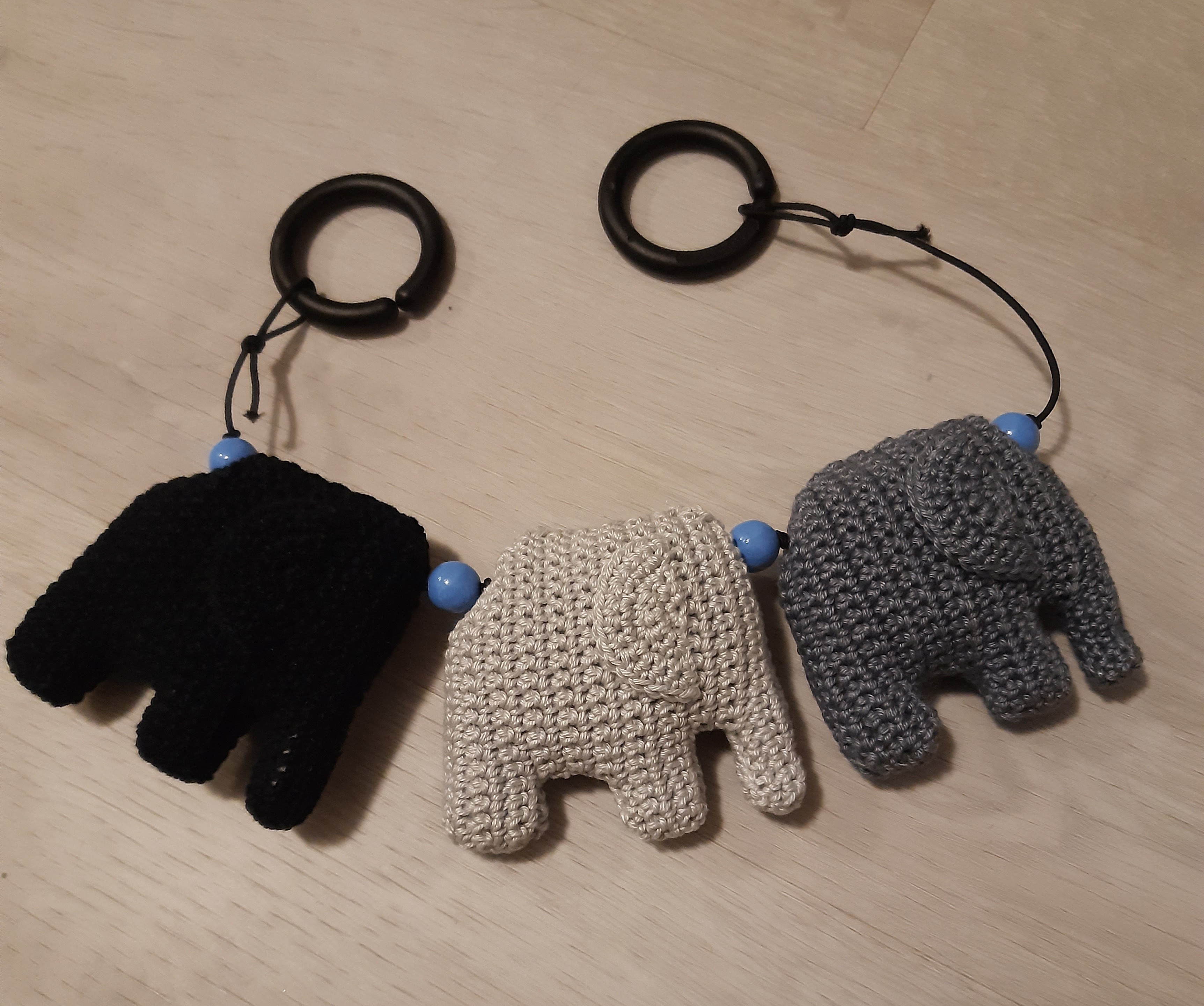 Puuvillalangasta virkattu vauvan vaunukoriste. Puuhelmet ja kuminauha. Kiinnitysrenkaat. Huom!!Tämä ei ole lelu vaan koriste.
