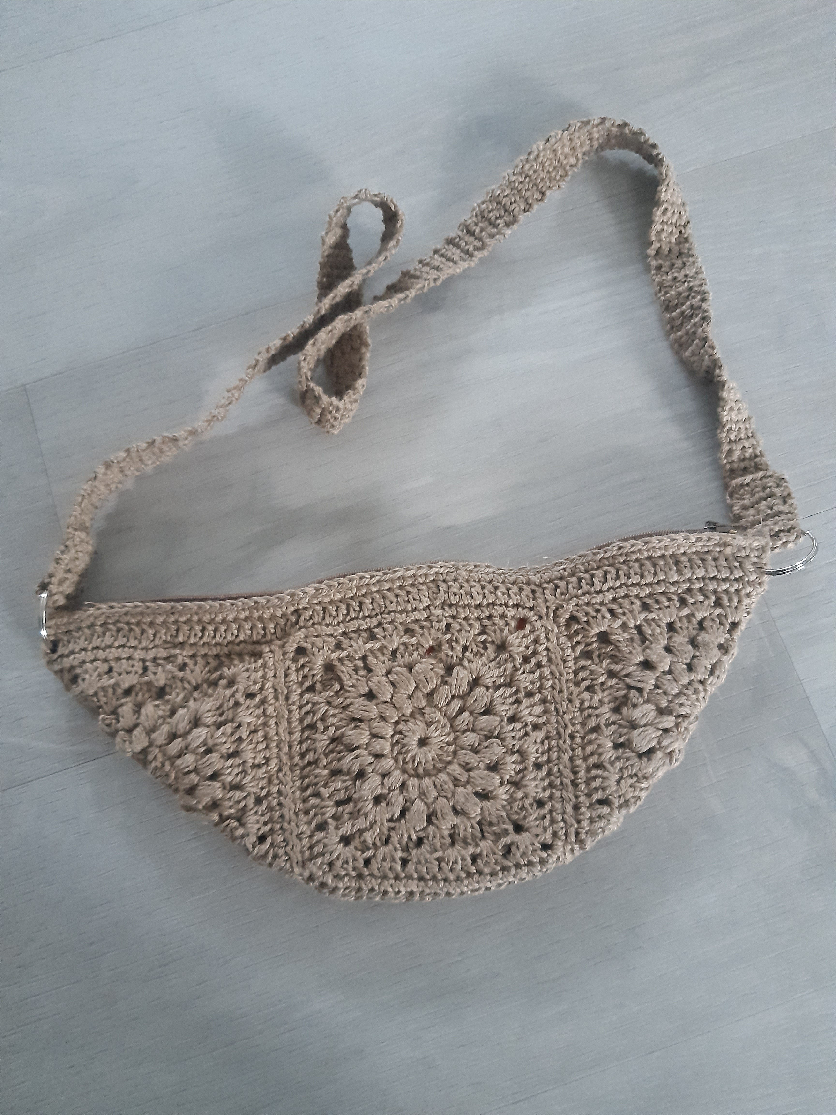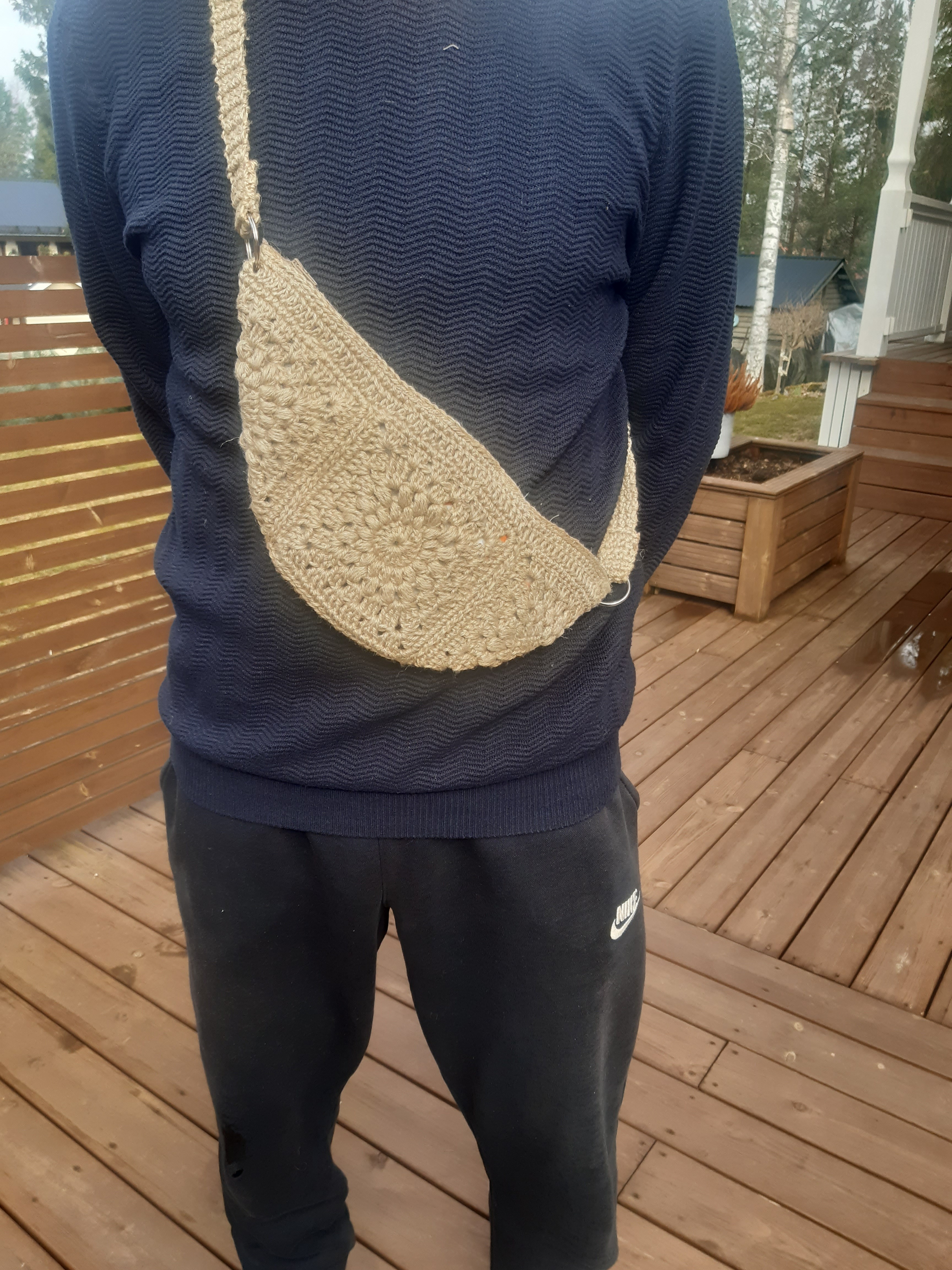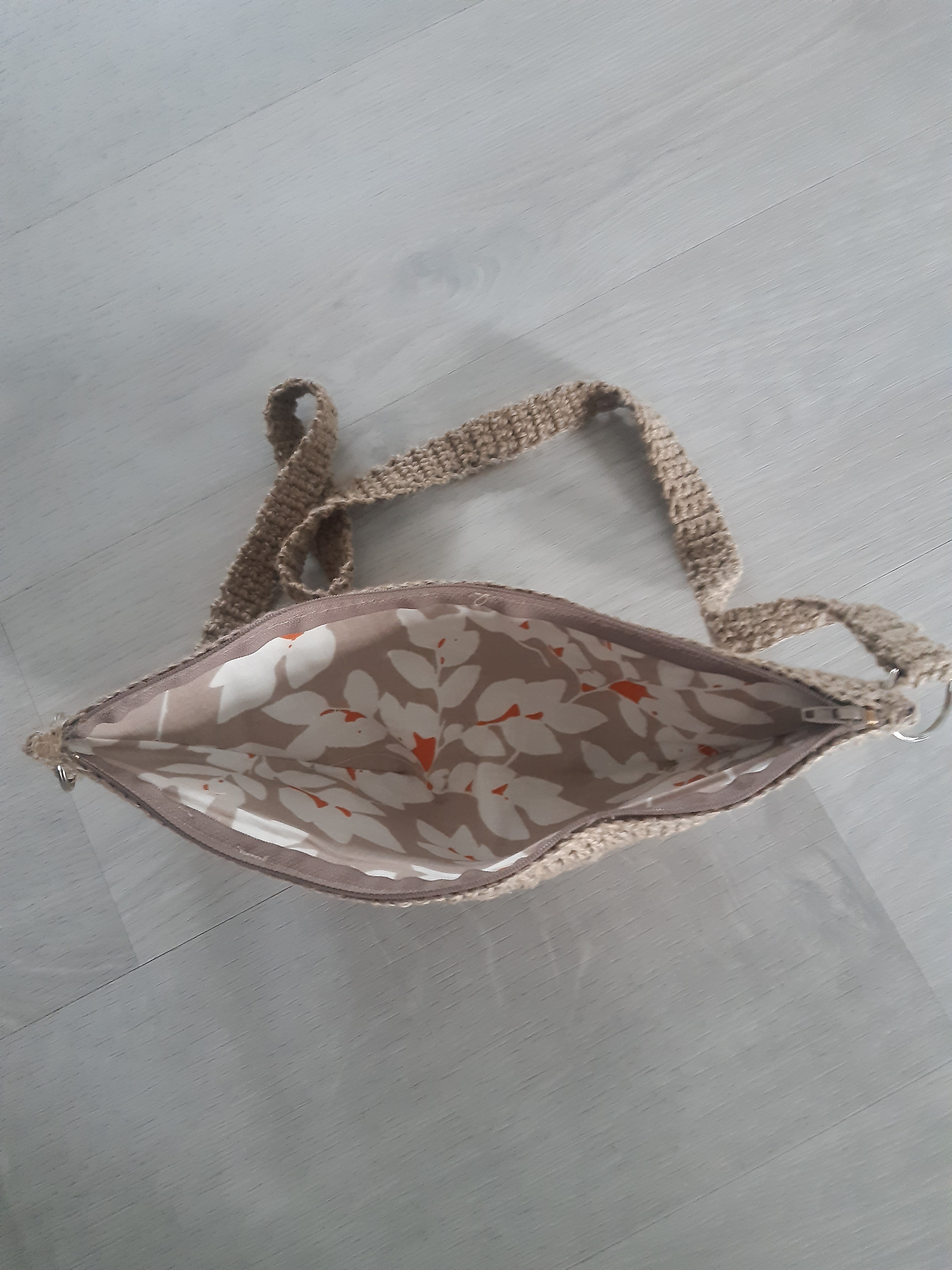 Isoäidin neliöistä virkattu vuoritettu pikkulaukku rouheasta pellavalangasta.