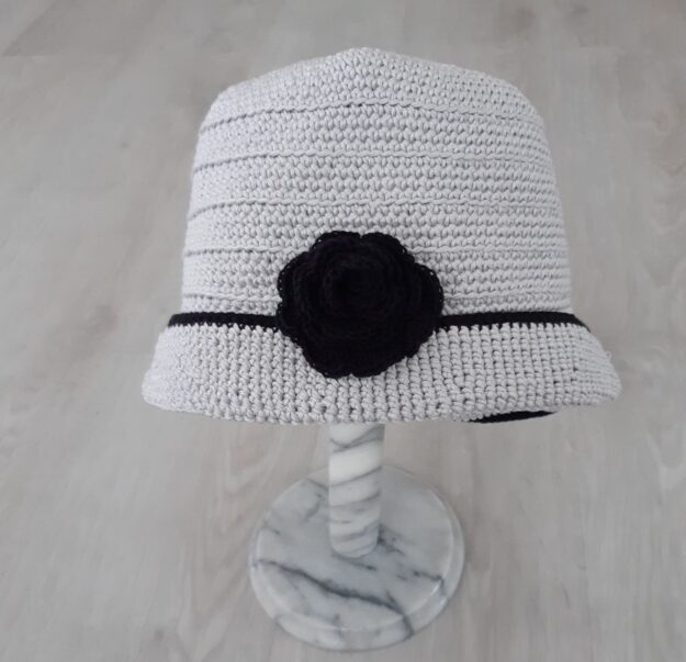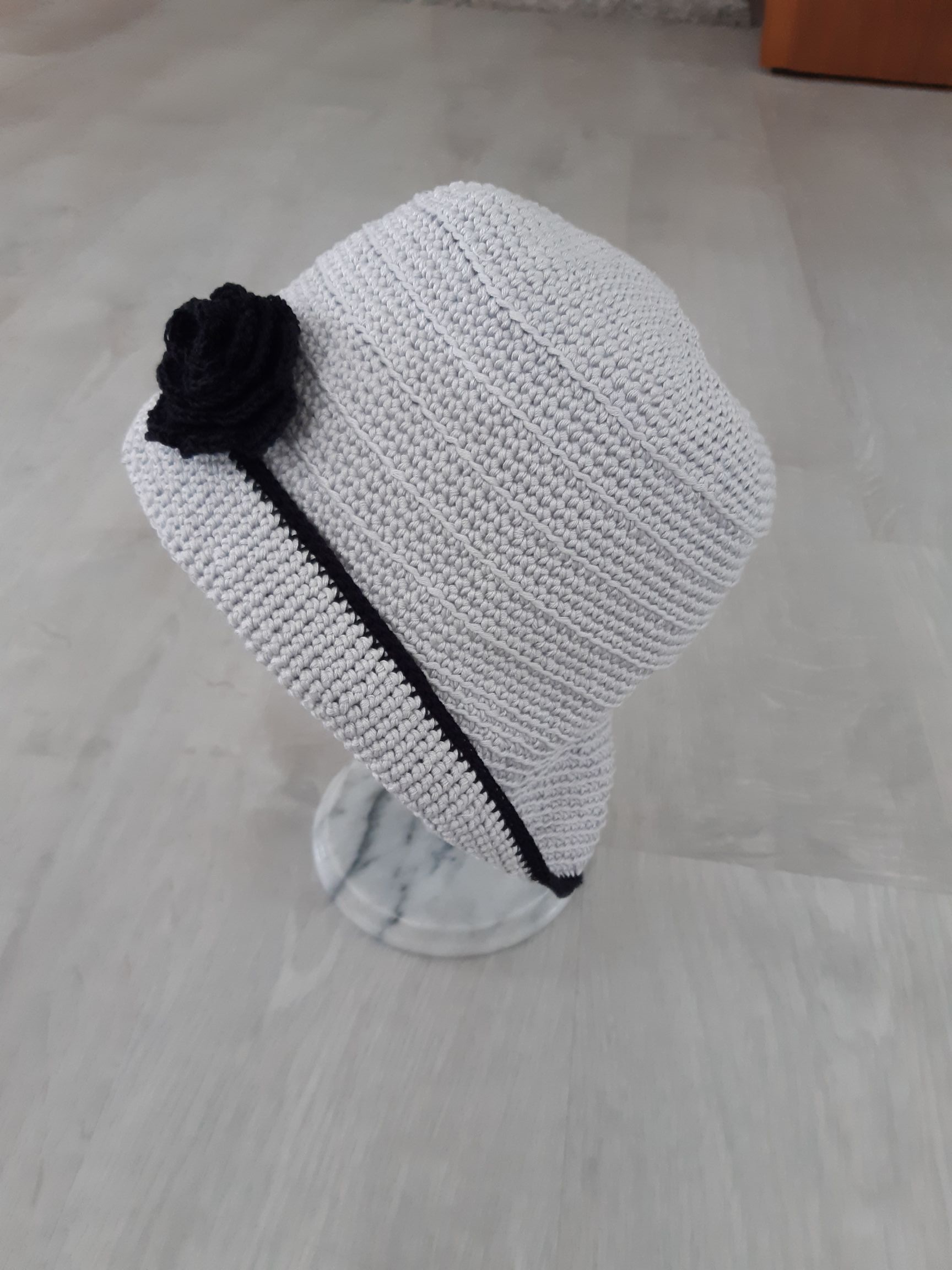 Puuvillalangasta virkattu hattu. N.54 cm – 56 cm. Kukkaa